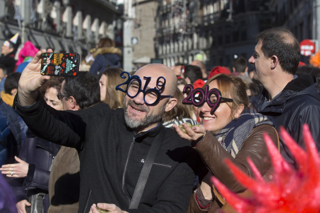 Revellers take selfies during a New year's day's Eve rehearsal celebration in Madrid, Spain, Monday. -- Associated Press